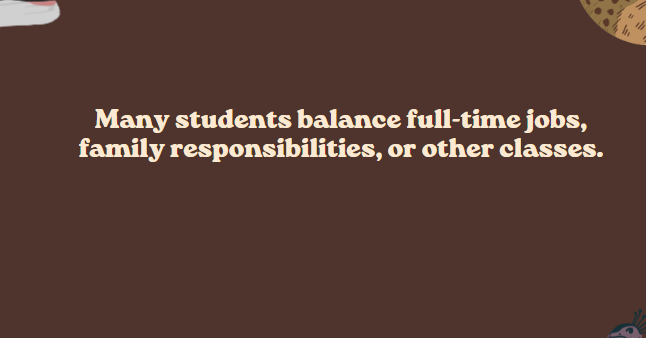 Many students balance full-time jobs, family responsibilities, or other classes.