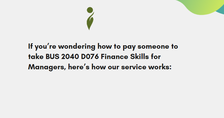 If you’re wondering how to pay someone to take BUS 2040 D076 Finance Skills for Managers, here’s how our service works: